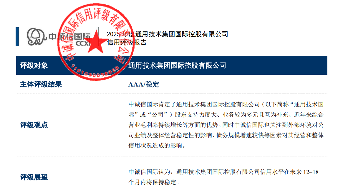 近日,中誠信國際信用評級有限責任公司發布評級報告,通用技術國際公司主體信用等級被評定為“AAA”,評級展望為“穩定”。